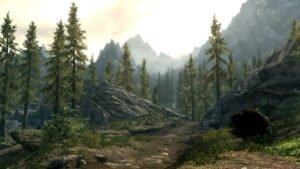 Skyrim constrói um mundo medieval rico e vivo, onde cada cenário parece contar uma história.
